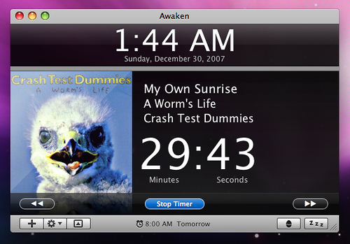 Awaken rocks a good bit. I'm probably going to move to it as my alarm clock--it'll be a whole lot less abrasive than my blaring alarm clock from 1988 (that my girlfriend despises). And then I'll probably start using it as my sleep timer too, since it'd be pretty cool to toss a movie into iTunes and have it shut down my Mac when it's done.